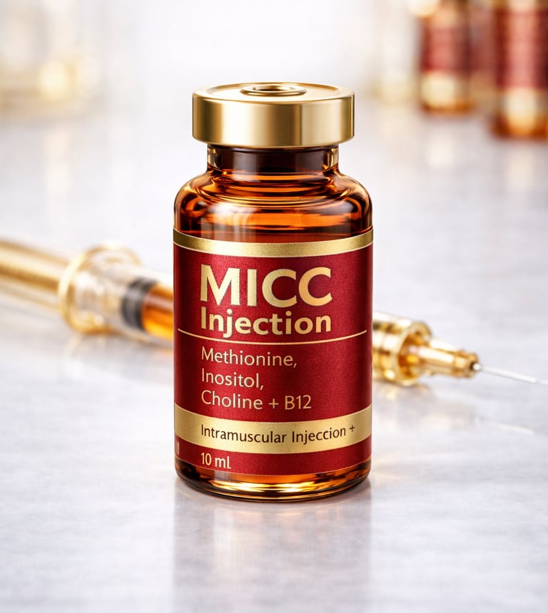 Our MICC Injections (Skinny Shots) combine Methionine, Inositol, Choline, and B12 to support fat metabolism, boost energy production, and enhance weight loss when paired with GLP-1 programs or a healthy lifestyle.
