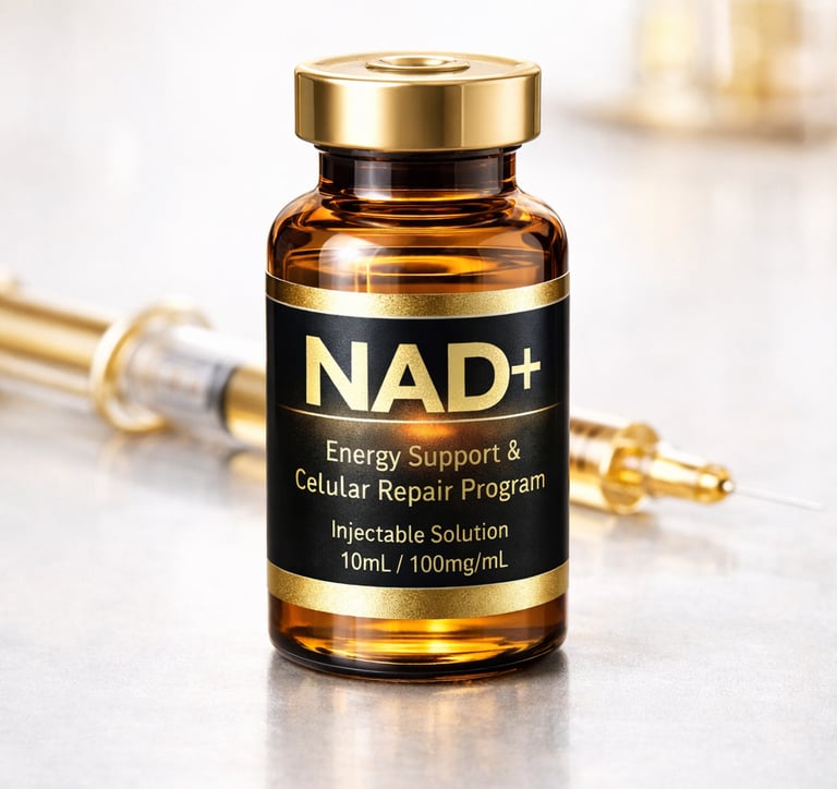 Our NAD+ therapy helps boost energy, support metabolism, and enhance overall wellness through quick intramuscular treatments designed to promote cellular repair and healthy aging.