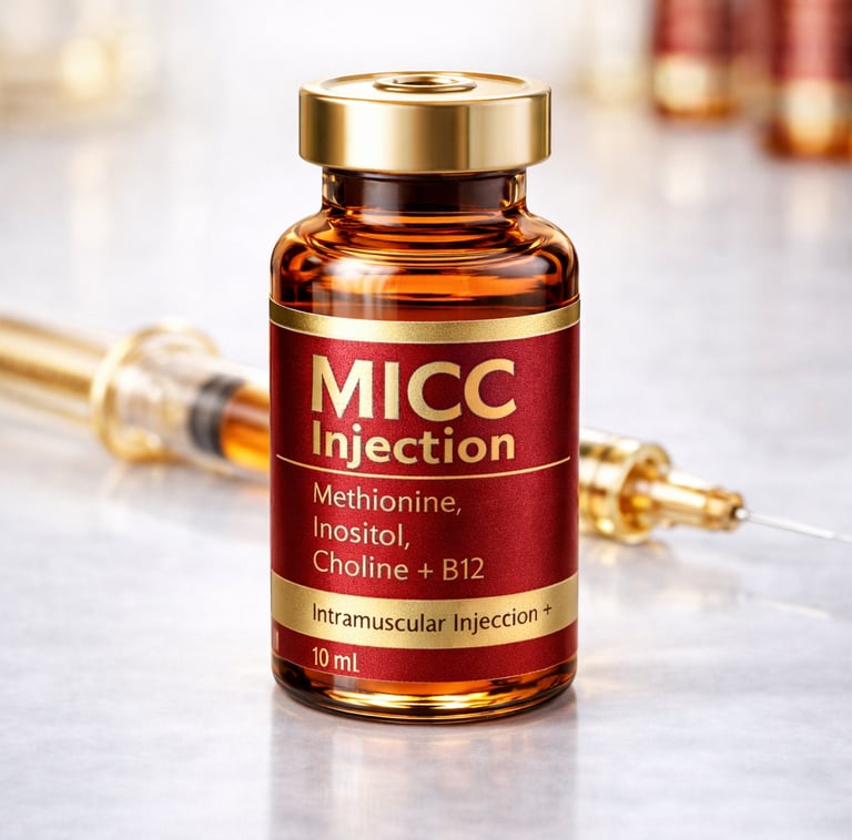Our MICC Injections (Skinny Shots) combine Methionine, Inositol, Choline, and B12 to support fat metabolism, boost energy production, and enhance weight loss when paired with GLP-1 programs or a healthy lifestyle.